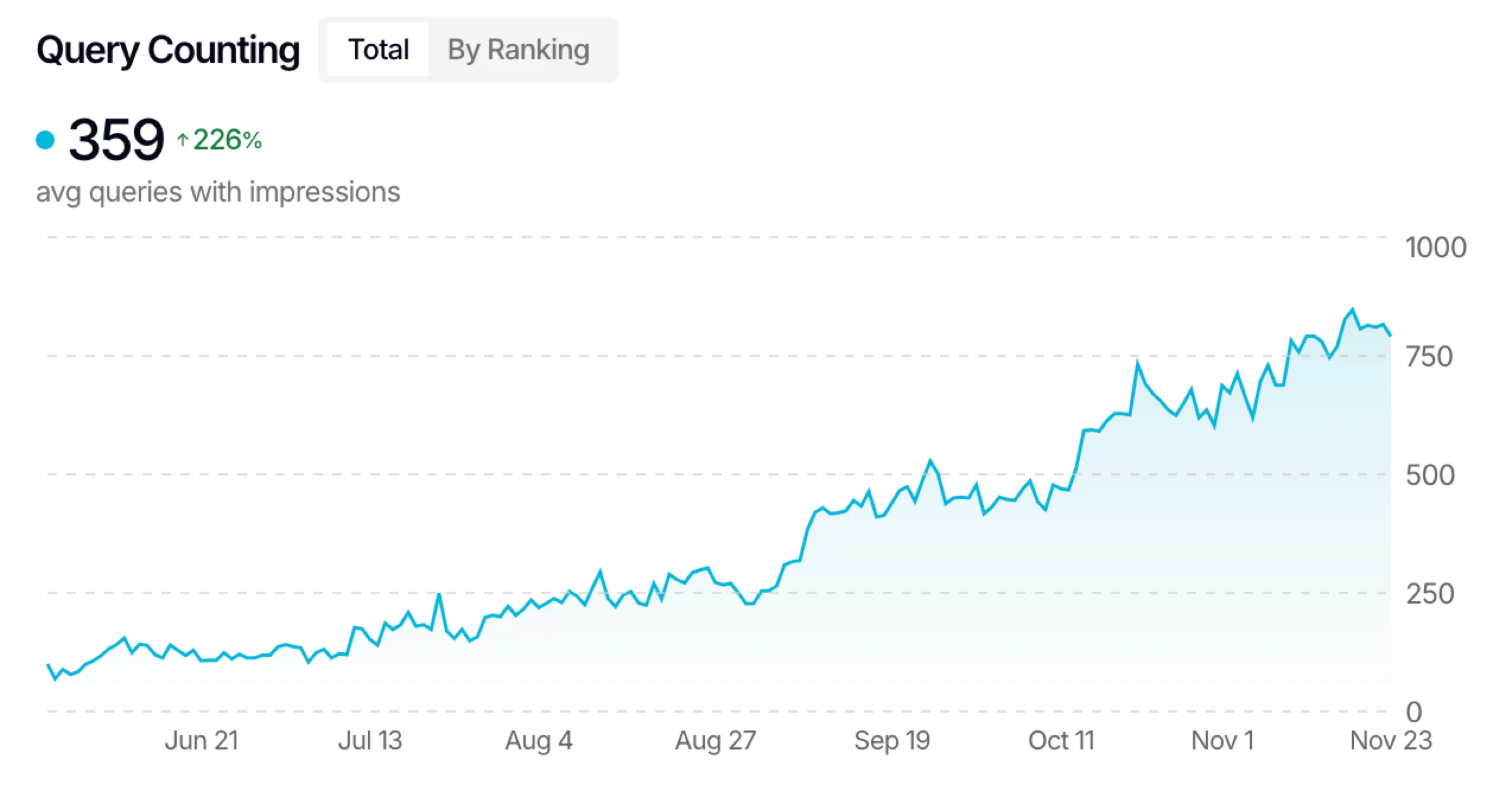 The site was expanding its topical authority (more queries) even as seasonal demand for those topics declined (fewer impressions). Without query counting, you might incorrectly assume your SEO efforts weren’t working when in fact, you were building a stronger foundation.