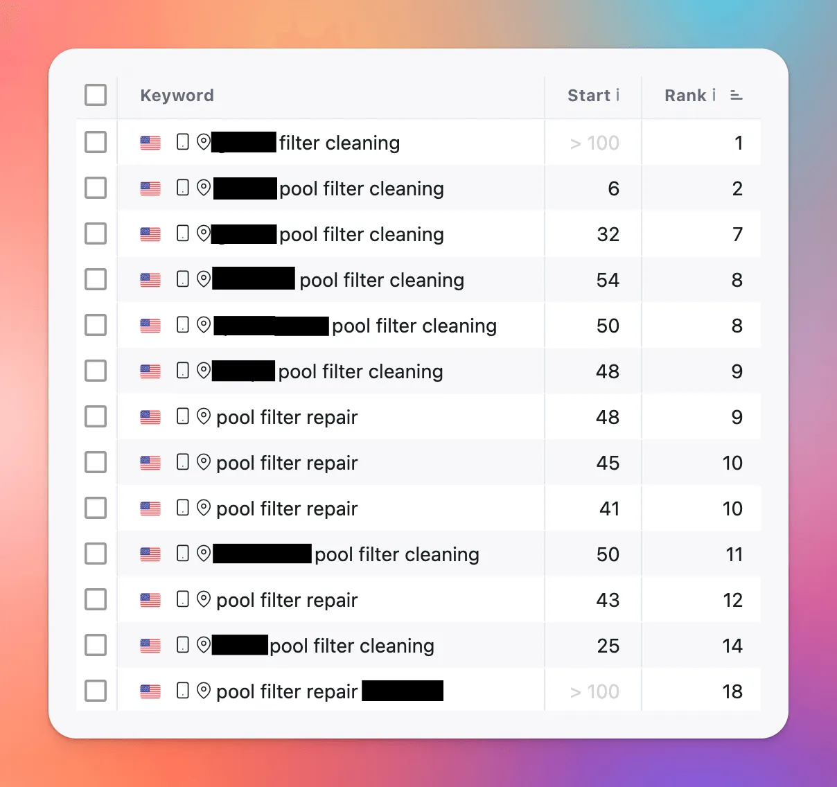 Currently, we’re ranking in the top 10 for several of our service keywords and continue to see weekly improvements.