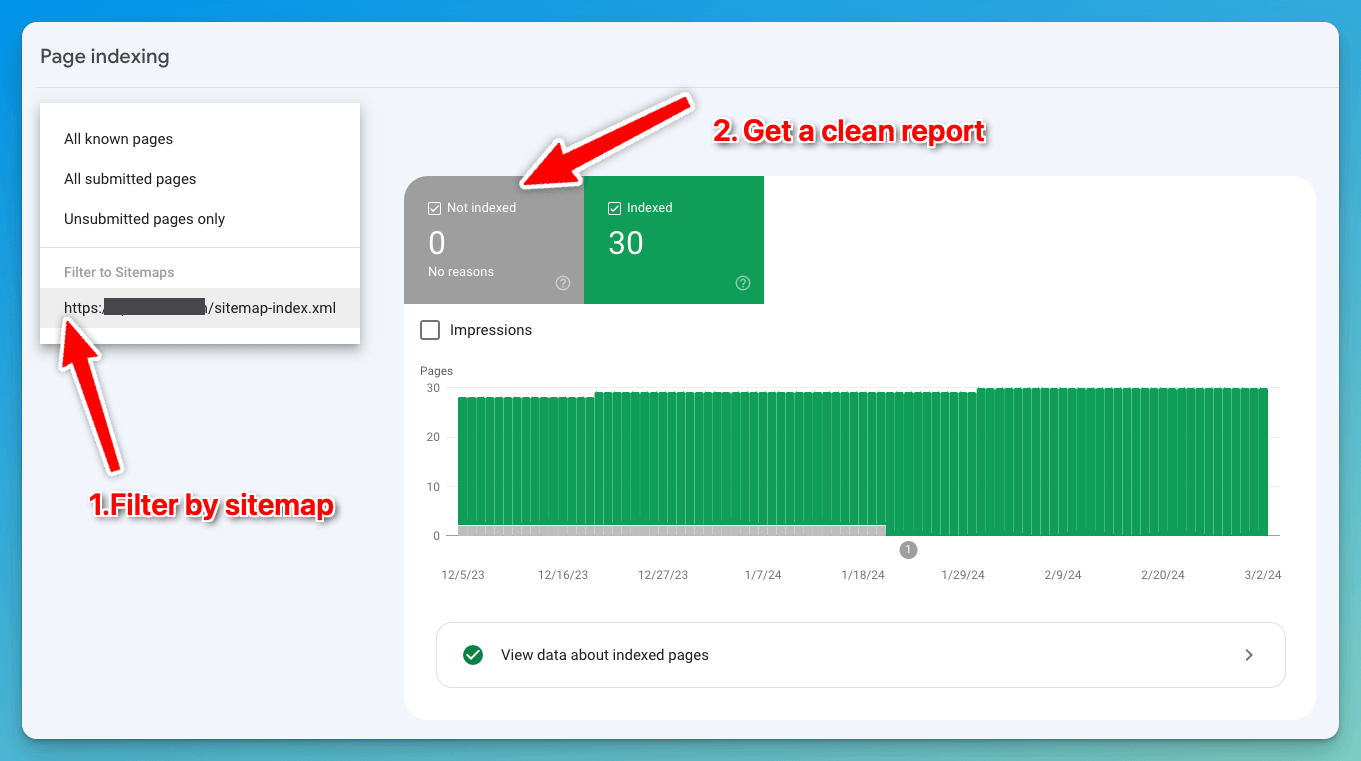 By using this filter, I can see the indexing status of the pages I truly care about. Red flag goes up whenever I see a page in the sitemap but that’s not indexed, that’s when I know I have to take action and fix it.