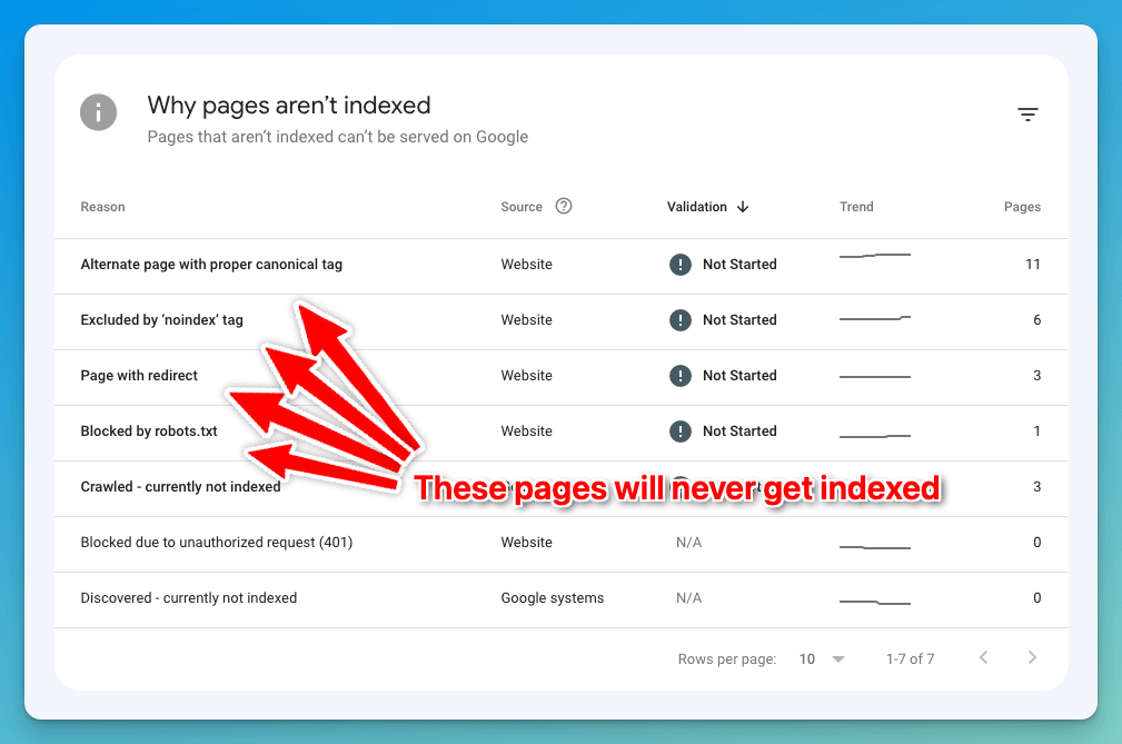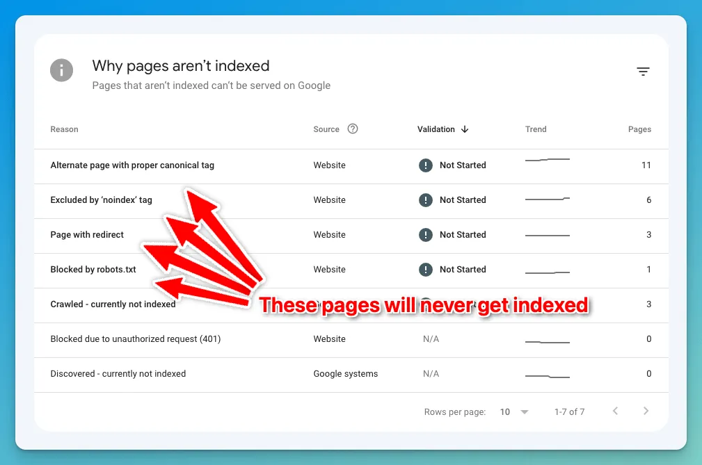 It’s inevitable that as your site grows, this report will have a mix of pages in both Indexed and Not Indexed state. While you can use the Indexing API or improve your site structure and internal linking to index your pages faster, there’ll always be pages stuck in the Not Indexed state.