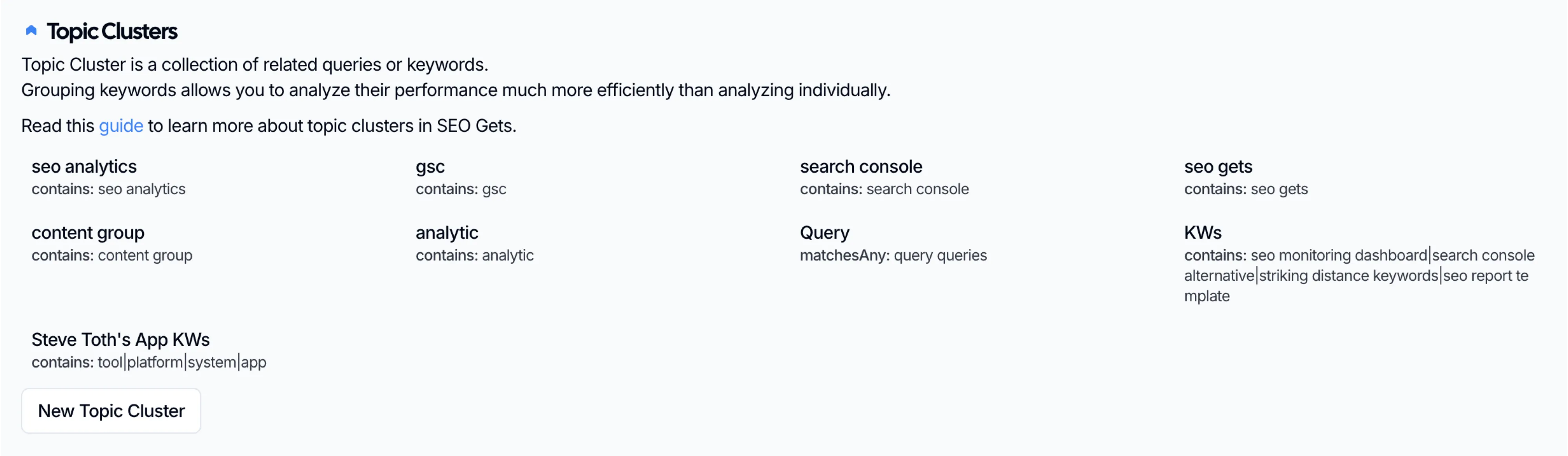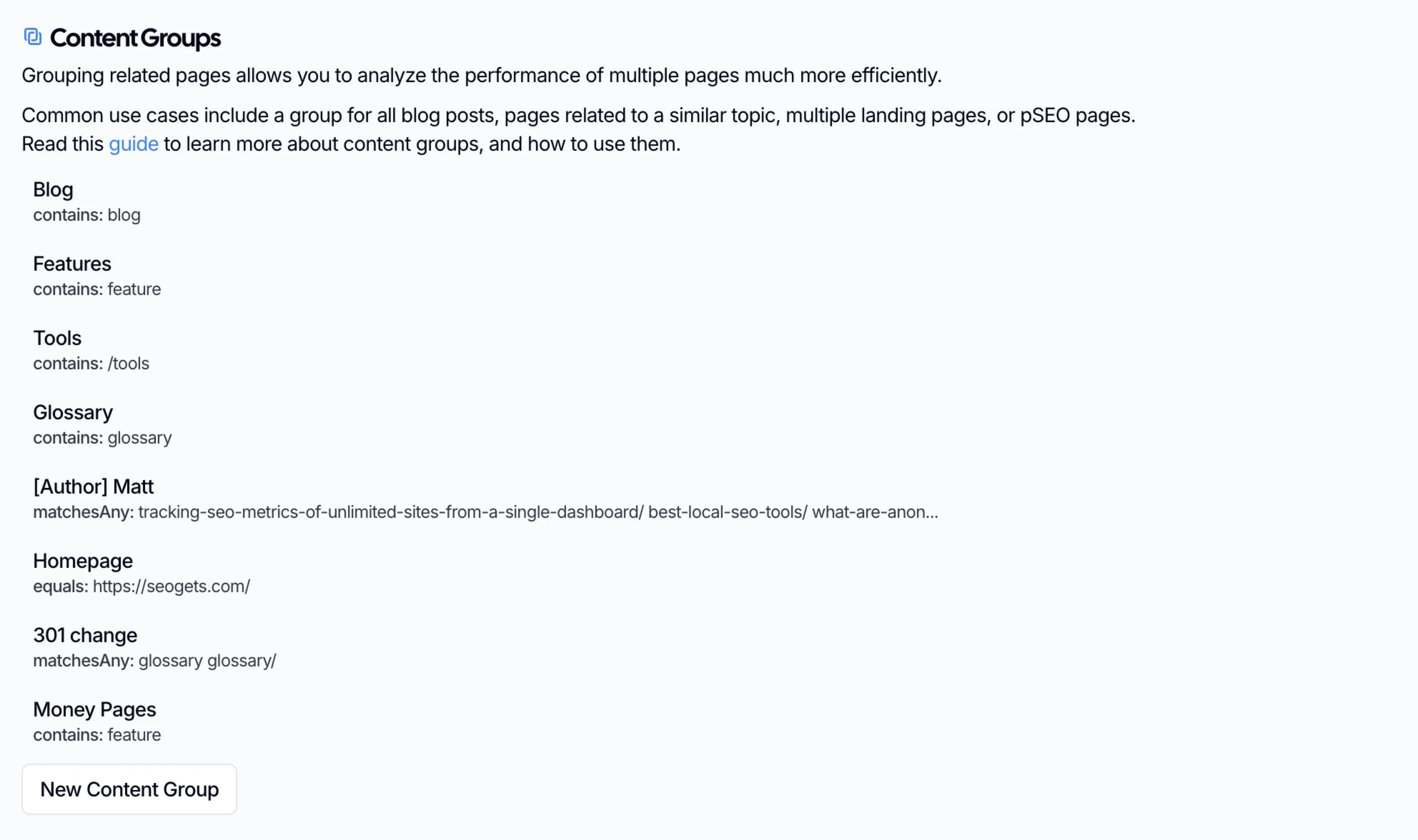 - Removes GSC’s API Character limit for content groups and topic clusters.