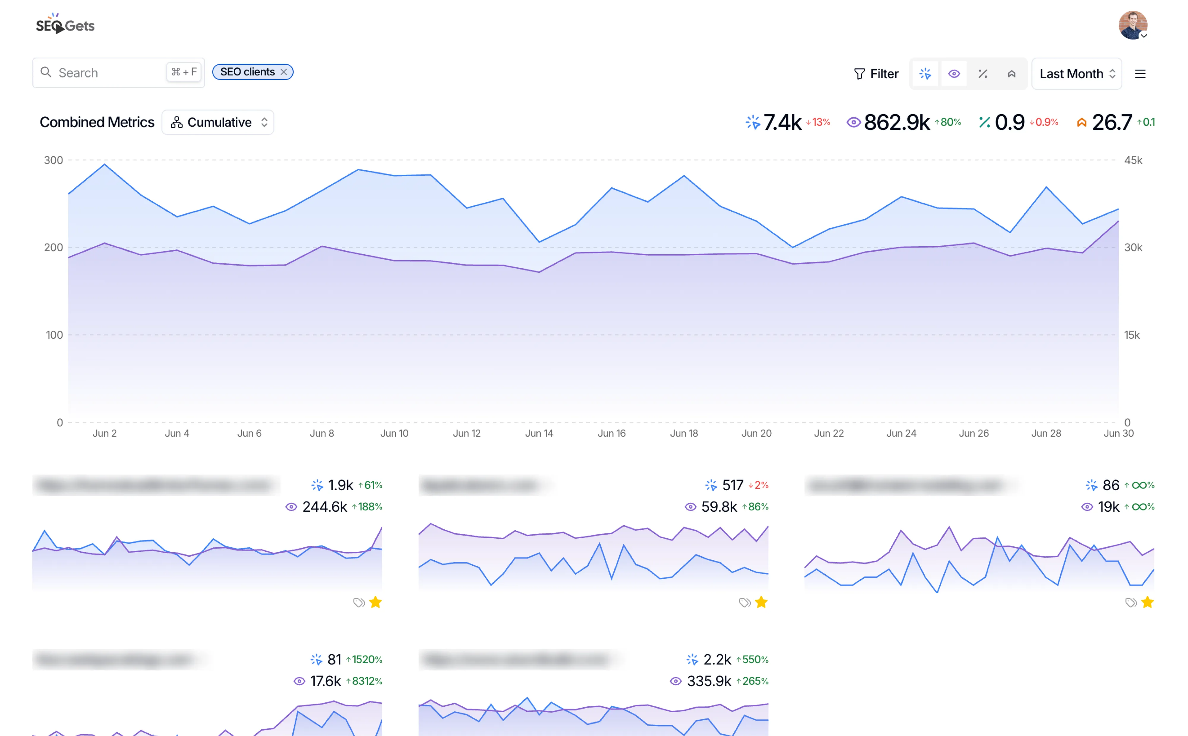 We track everything through portfolio metrics in SEO Gits, giving us a unified view across all clients rather than getting lost in individual site metrics.
