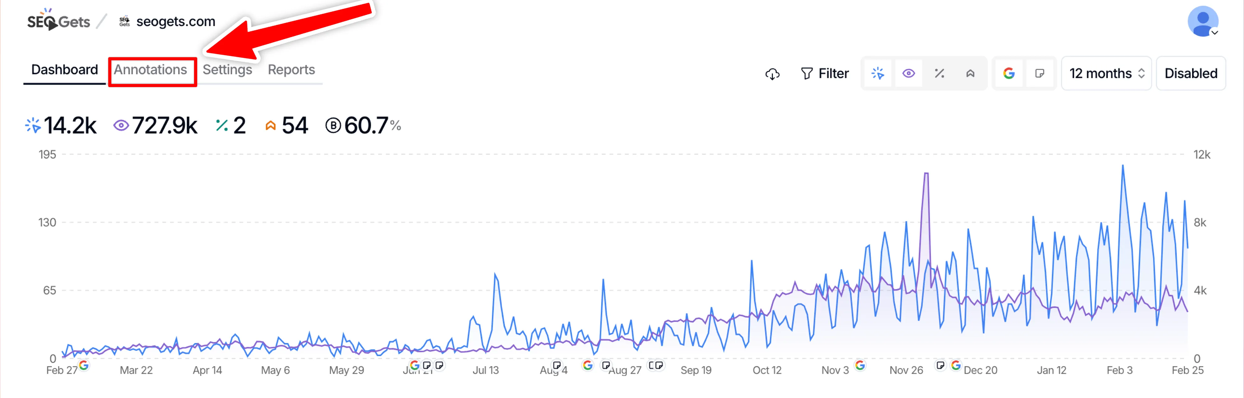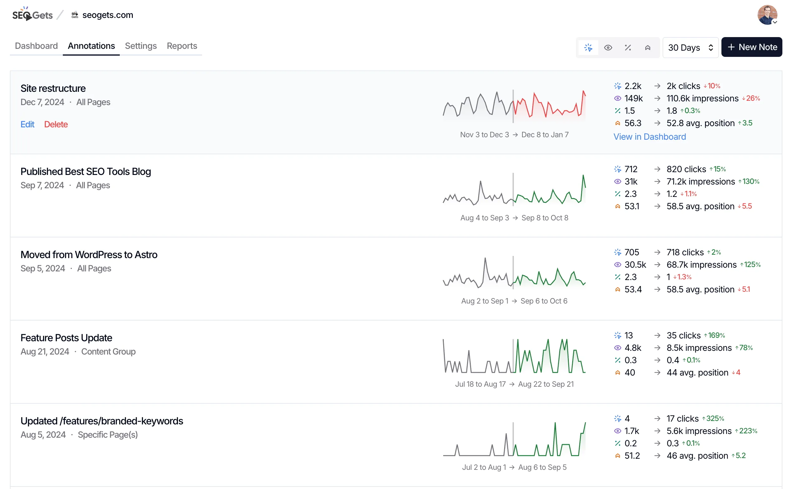 The real power of annotations comes when you analyze their impact. In the annotations tab of SEO Gets, you can: