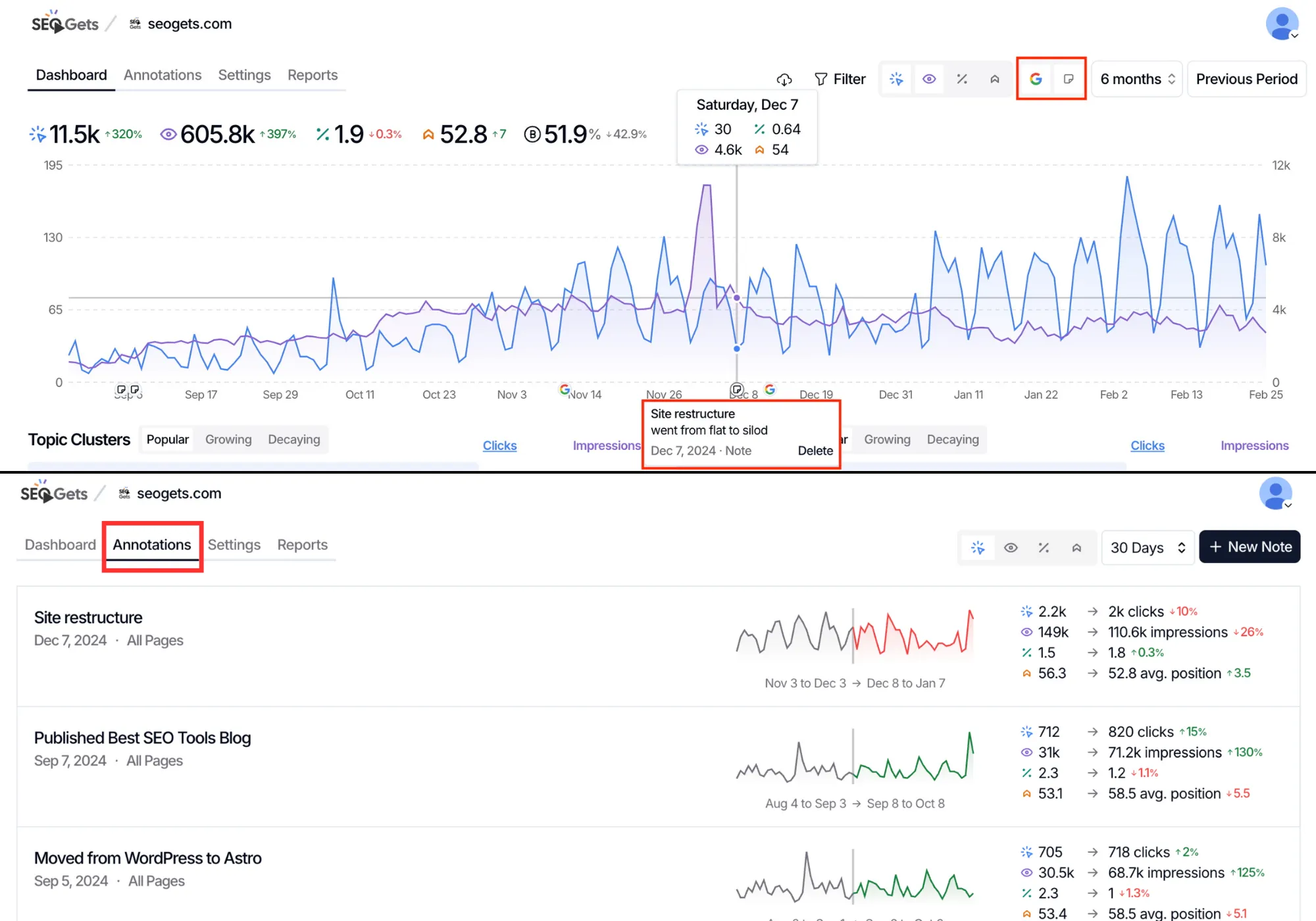 The real power of annotations comes when you analyze their impact. In the annotations tab of SEO Gets, you can: