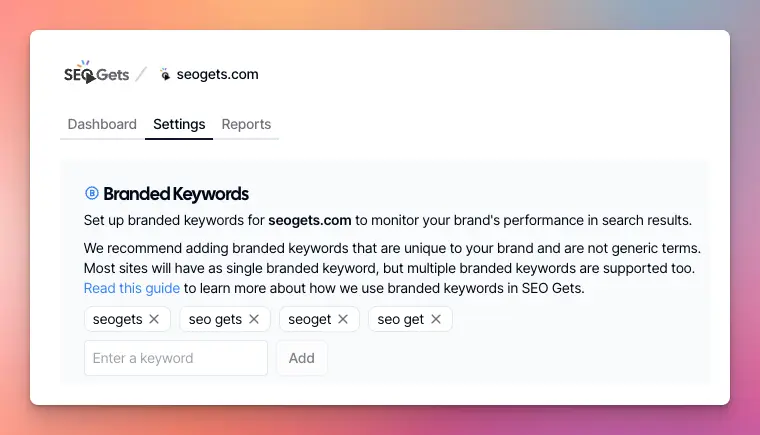 Learn how to setup and use Branded Keywords in SEO Gets to monitor your brand's popularity and non-brand organic traffic.