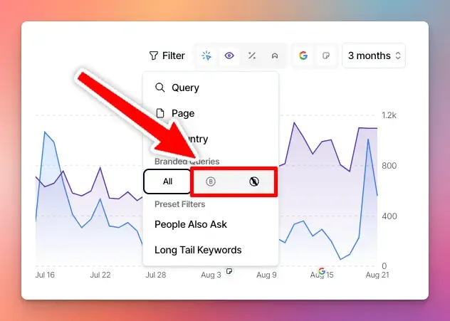 After setting up your keywords, you’ll find the Branded Queries options inside the filter dropdown in your dashboard.