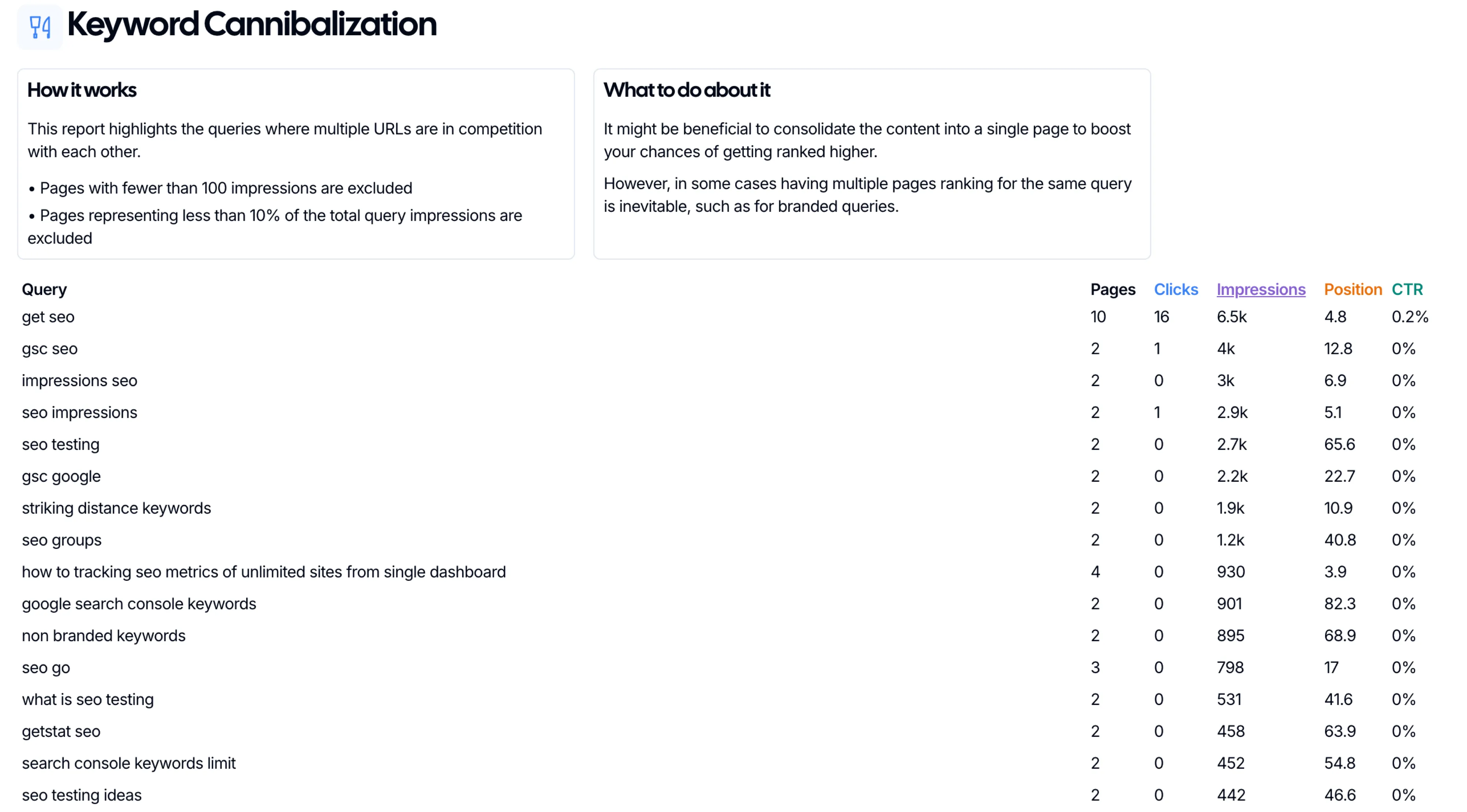 We don’t guess based on content similarity. We analyze your actual Google Search Console data to find genuine ranking conflicts.