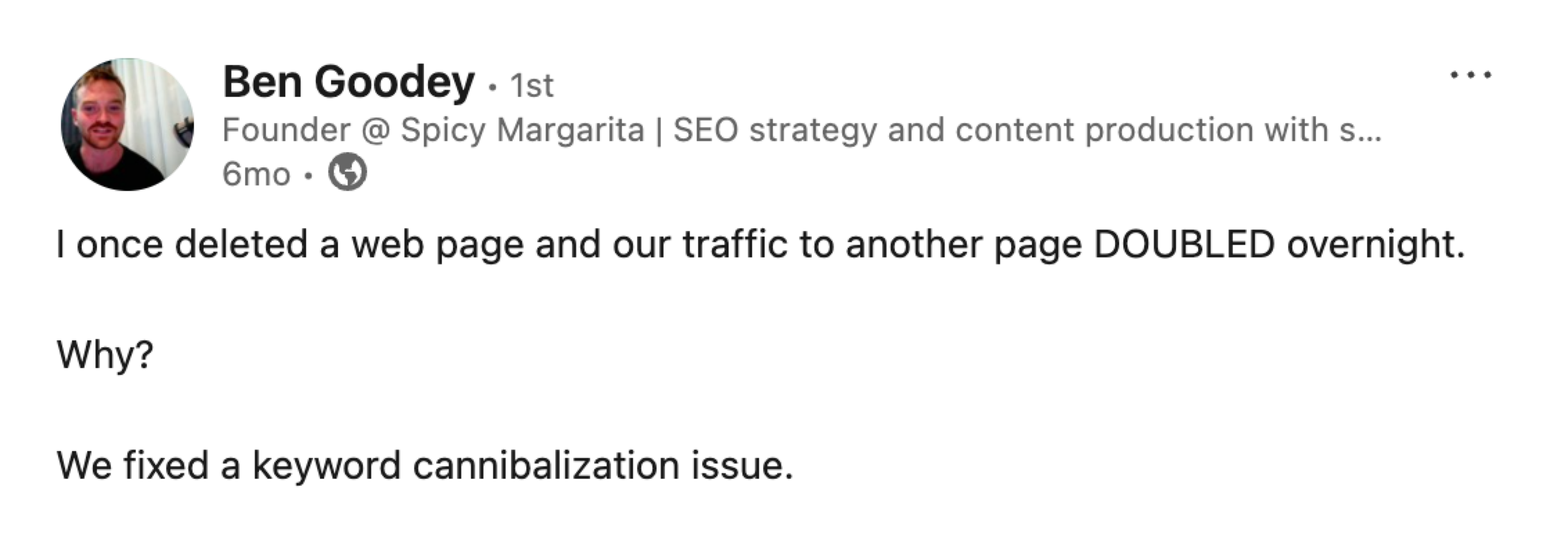Ben Goodey at Spicy Margarita fixed a cannibalization issue by deleting a page, doubling the traffic to the right page.