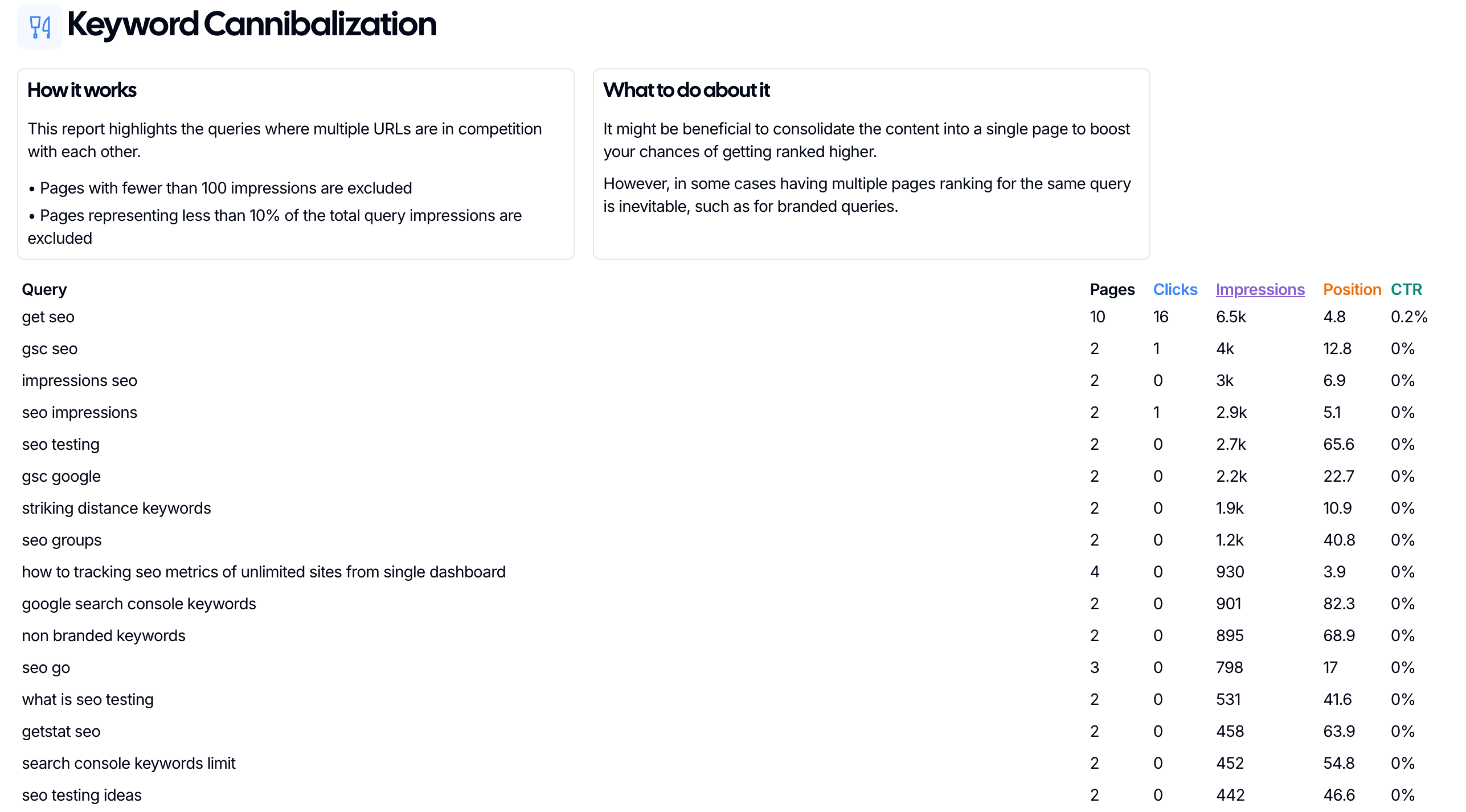 Our Cannibalization Analyzer instantly identifies which of your pages are fighting for the same keywords, so you can fix the conflicts and boost your rankings.