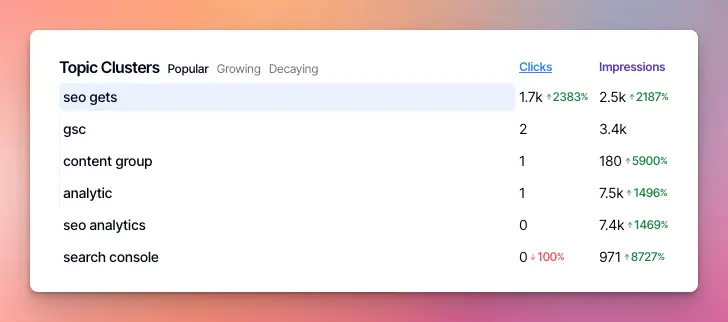 After setting up your keywords, you’ll find them in your dashboard under the Topic Clusters section. From here you can filter your Topic Clusters by popular, growing, and decaying and sort by clicks or impressions.