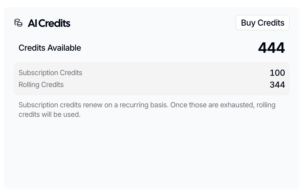 If your account includes subscription credits, this balance shows what you have left in the current cycle. Rolling credits are purchased using the Buy Credits button and rollover from month to month.