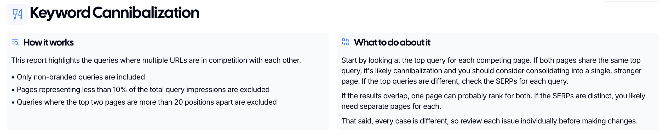 Use the Keyword Cannibalization report when more than one page is competing for the same query. It helps you spot overlap fast, pick the page you want to rank, and decide what to fix next.
