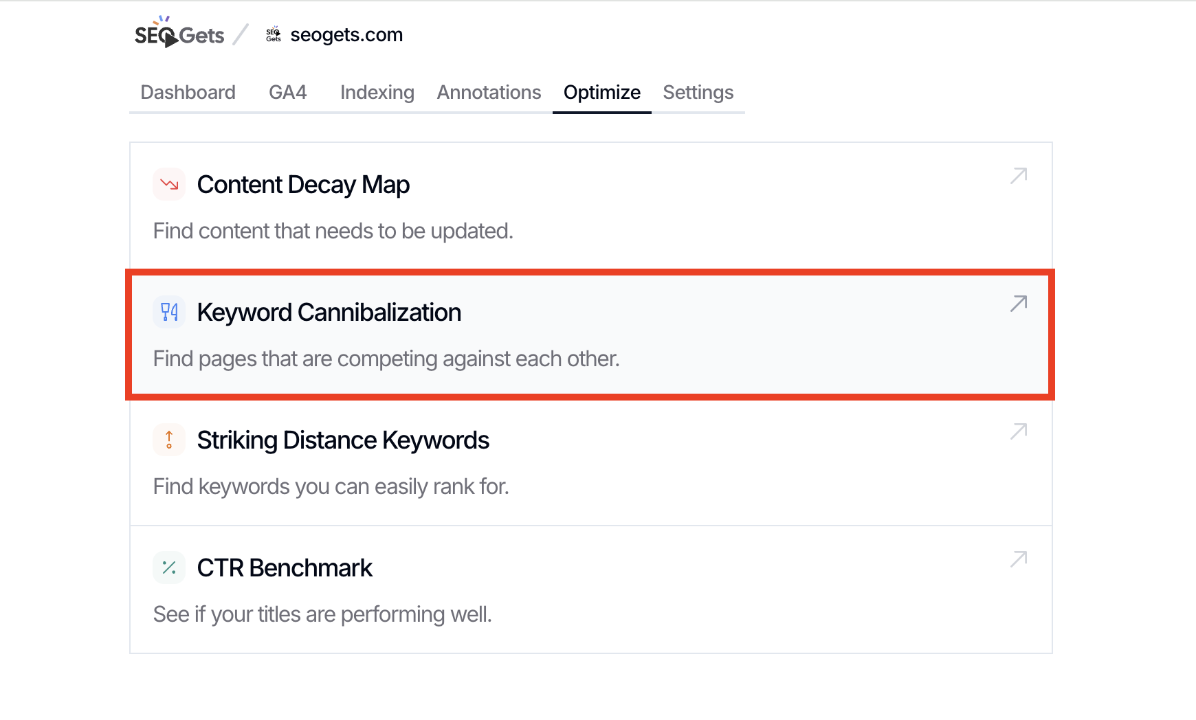 To find low-value pages in SEO Gets, navigate to the Optimize section to access the Keyword Cannibalization tool.