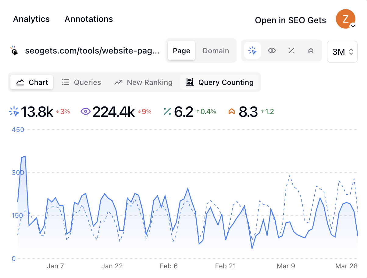 The SEO Gets Chrome Extension gives you quick access to GSC analytics for your connected properties while you browse, so you can check page-level data, add annotations, and jump into your dashboard without stopping what you’re doing. This customer-favorite extension is optional, but provides a valuable shortcut if you spend a lot of time reviewing pages in Chrome.