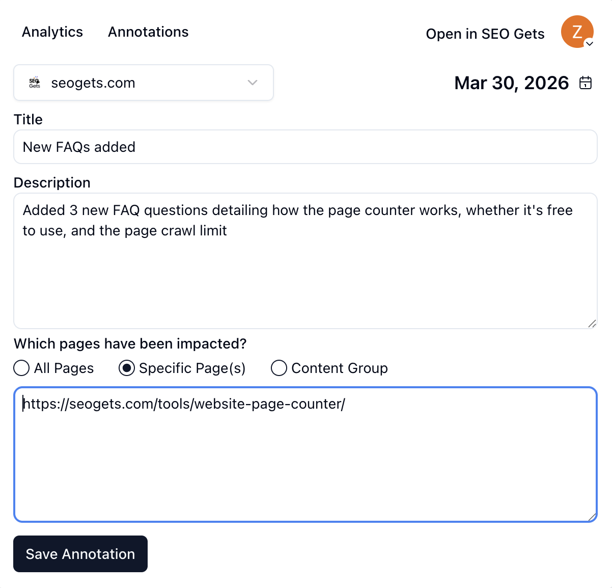Add annotations in seconds: create detailed annotations in a few clicks that sync with your annotations report in SEO Gets.