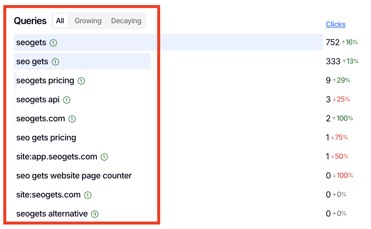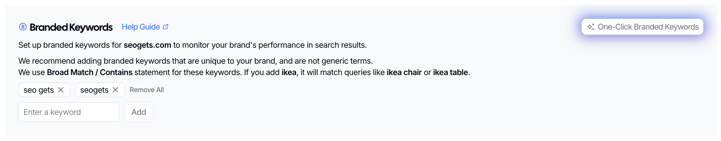 Branded keywords help you filter out searches that include your brand name in SEO Gets, providing a clearer picture of branded keyword performance.
