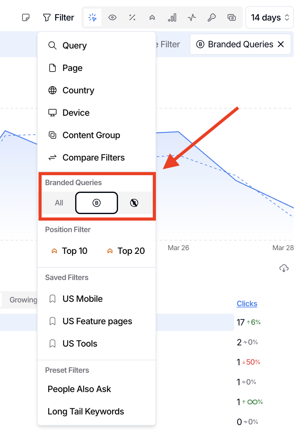 After the filter is applied, you can use the dashboard to review clicks, impressions, and trends for branded searches only using the Branded Queries filter. If the results look too broad, tighten the filter. If they miss obvious brand searches, add more variations.