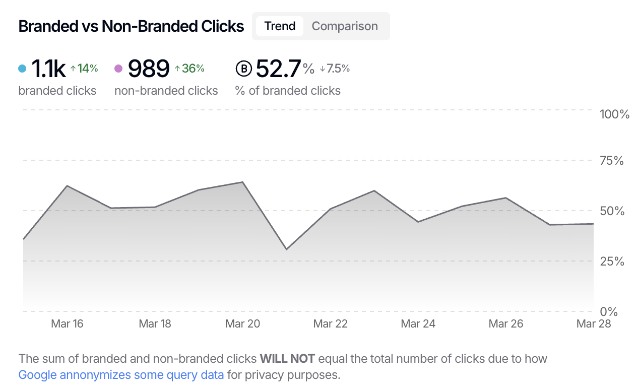 And it doesn't stop there! Once you've confirmed that your branded keyword filters are working, clear your filters and navigate to the Branded vs Non-Branded Clicks report on your dashboard to compare how each group is performing and see a percentage of branded clicks to guide your SEO efforts and balance your funnel.