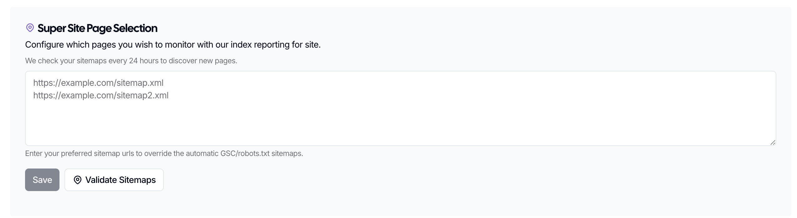 Each Super Site can track up to 5,000 pages for Index Reporting. If your site is larger than that, choose the most important sitemaps and page groups in settings, or use additional Super Sites for subfolders or subdomains.