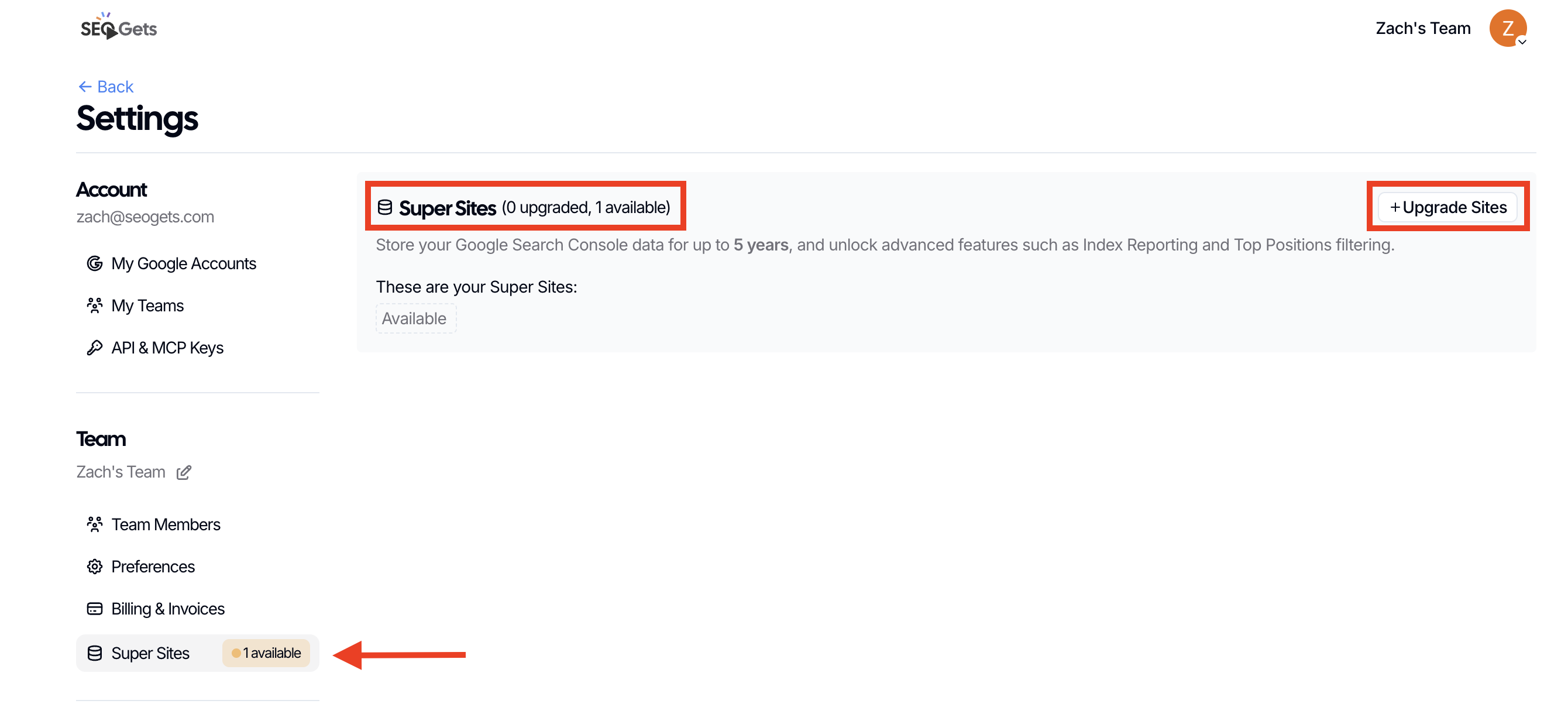 Click on +Upgrade Super Sites.