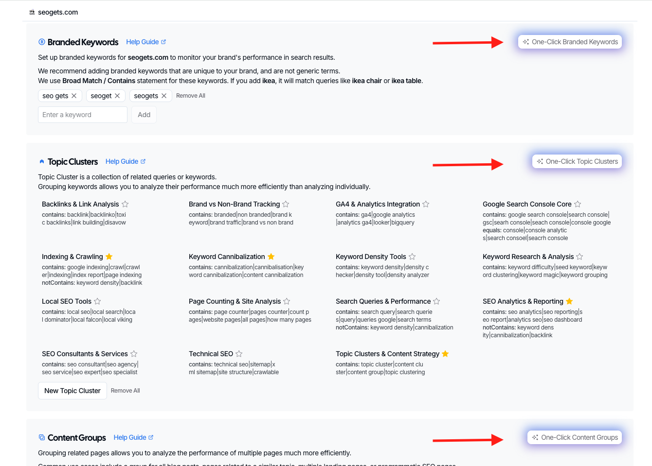 Use the One-Click Setup button to instantly generate topic clusters, content groups, and branded keywords for any site—no manual configuration required. It's the fastest way to unlock deeper insights in SEO Gets.