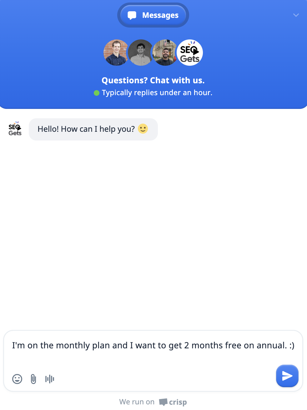 If it's your first time subscribing to SEO Gets, you can opt for an annual plan to start saving on your SEO Gets subscription. You may also be able to use a discount code on your annual subscription. For more information on discount codes, check out How to use a discount code.